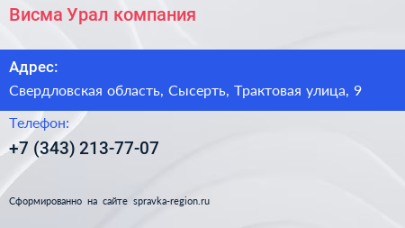 Висма-Урал, компания по адресу Свердловская область, Сысерть, Трактовая улица, 9 в дальнейшем Организация, размещена в следующих категориях: