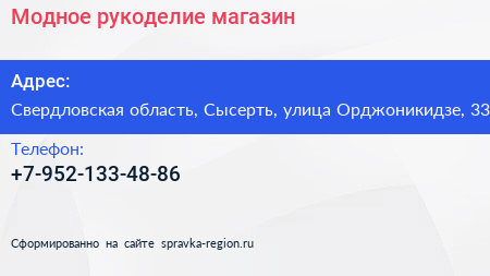 Модное рукоделие, магазин по адресу Свердловская область, Сысерть, улица Орджоникидзе, 33 в дальнейшем Организация, размещена в следующих категориях: