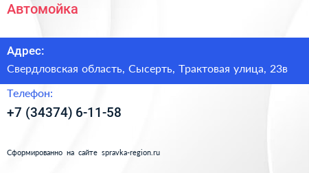 Автомойка по адресу Свердловская область, Сысерть, Трактовая улица, 23в в дальнейшем Организация, размещена в следующих категориях: