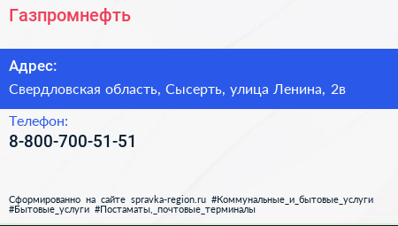 Газпромнефть по адресу Свердловская область, Сысерть, улица Ленина, 2в в дальнейшем Организация, размещена в следующих категориях: