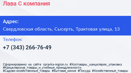 Лава-С, компания по адресу Свердловская область, Сысерть, Трактовая улица, 13 в дальнейшем Организация, размещена в следующих категориях: