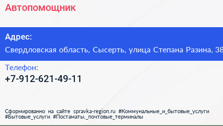 Автопомощник по адресу Свердловская область, Сысерть, улица Степана Разина, 38 в дальнейшем Организация, размещена в следующих категориях: