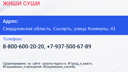 ЖИШИ СУШИ по адресу Свердловская область, Сысерть, улица Коммуны, 41 в дальнейшем Организация, размещена в следующих категориях: