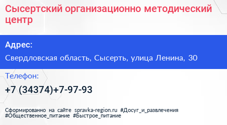 Сысертский организационно-методический центр по адресу Свердловская область, Сысерть, улица Ленина, 30 в дальнейшем Организация, размещена в следующих категориях: