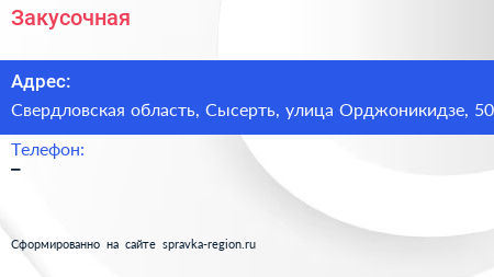 Закусочная по адресу Свердловская область, Сысерть, улица Орджоникидзе, 50 в дальнейшем Организация, размещена в следующих категориях: