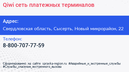 Qiwi, сеть платежных терминалов по адресу Свердловская область, Сысерть, Новый микрорайон, 22 в дальнейшем Организация, размещена в следующих категориях: