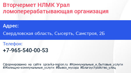 Вторчермет НЛМК Урал, ломоперерабатывающая организация по адресу Свердловская область, Сысерть, Самстроя, 2Б в дальнейшем Организация, размещена в следующих категориях: