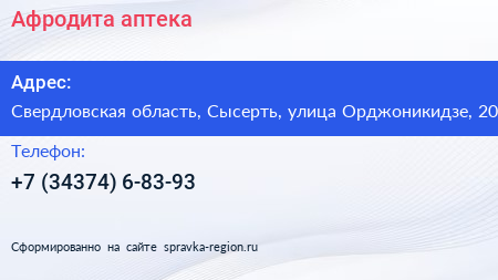 Афродита, аптека по адресу Свердловская область, Сысерть, улица Орджоникидзе, 20 в дальнейшем Организация, размещена в следующих категориях: