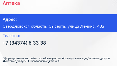 Аптека по адресу Свердловская область, Сысерть, улица Ленина, 43а в дальнейшем Организация, размещена в следующих категориях: