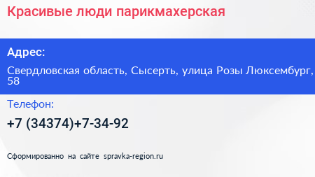 Красивые люди, парикмахерская по адресу Свердловская область, Сысерть, улица Розы Люксембург, 58 в дальнейшем Организация, размещена в следующих категориях: