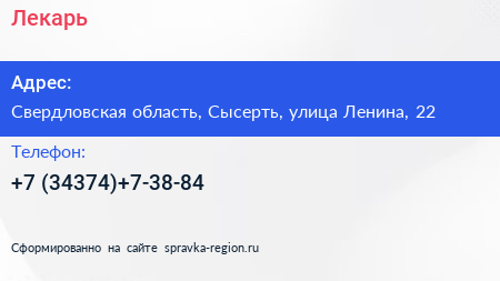 Лекарь по адресу Свердловская область, Сысерть, улица Ленина, 22 в дальнейшем Организация, размещена в следующих категориях: