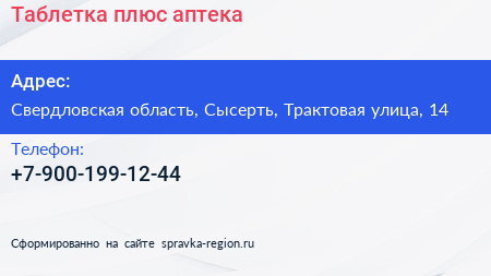 Таблетка плюс, аптека по адресу Свердловская область, Сысерть, Трактовая улица, 14 в дальнейшем Организация, размещена в следующих категориях: