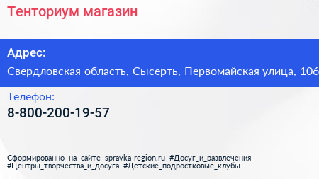 Тенториум, магазин по адресу Свердловская область, Сысерть, Первомайская улица, 106 в дальнейшем Организация, размещена в следующих категориях: