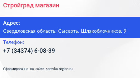 Стройград, магазин по адресу Свердловская область, Сысерть, Шлакоблочников, 9 в дальнейшем Организация, размещена в следующих категориях: