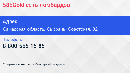 585Gold, сеть ломбардов по адресу Самарская область, Сызрань, Советская, 32 в дальнейшем Организация, размещена в следующих категориях: