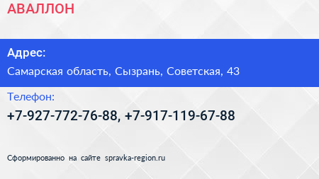 АВАЛЛОН по адресу Самарская область, Сызрань, Советская, 43 в дальнейшем Организация, размещена в следующих категориях: