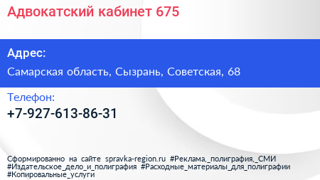 Адвокатский кабинет №675 по адресу Самарская область, Сызрань, Советская, 68 в дальнейшем Организация, размещена в следующих категориях: