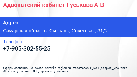 Адвокатский кабинет Гуськова А.В. по адресу Самарская область, Сызрань, Советская, 31/2 в дальнейшем Организация, размещена в следующих категориях: