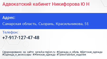 Адвокатский кабинет Никифорова Ю.Н. по адресу Самарская область, Сызрань, Красильникова, 51 в дальнейшем Организация, размещена в следующих категориях: