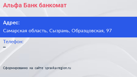 Альфа-Банк, банкомат по адресу Самарская область, Сызрань, Образцовская, 97 в дальнейшем Организация, размещена в следующих категориях: