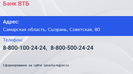 Банк ВТБ по адресу Самарская область, Сызрань, Советская, 80 в дальнейшем Организация, размещена в следующих категориях: