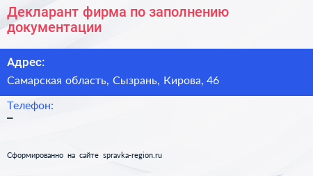 Декларант, фирма по заполнению документации по адресу Самарская область, Сызрань, Кирова, 46 в дальнейшем Организация, размещена в следующих категориях: