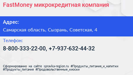 FastMoney, микрокредитная компания по адресу Самарская область, Сызрань, Советская, 4 в дальнейшем Организация, размещена в следующих категориях:
