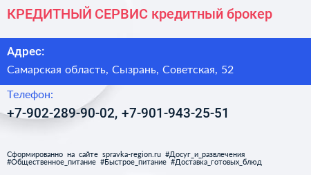 КРЕДИТНЫЙ СЕРВИС, кредитный брокер по адресу Самарская область, Сызрань, Советская, 52 в дальнейшем Организация, размещена в следующих категориях: