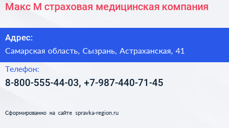 Макс-М, страховая медицинская компания по адресу Самарская область, Сызрань, Астраханская, 41 в дальнейшем Организация, размещена в следующих категориях: