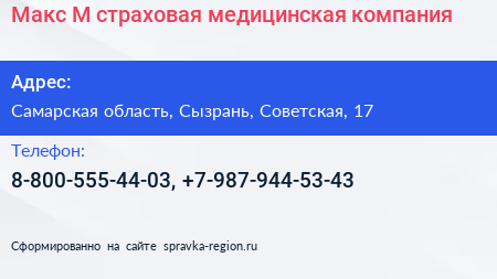 Макс-М, страховая медицинская компания по адресу Самарская область, Сызрань, Советская, 17 в дальнейшем Организация, размещена в следующих категориях: