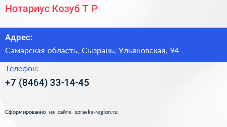 Нотариус Козуб Т.Р. по адресу Самарская область, Сызрань, Ульяновская, 94 в дальнейшем Организация, размещена в следующих категориях: