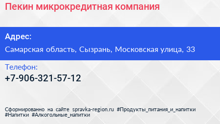 Пекин, микрокредитная компания по адресу Самарская область, Сызрань, Московская улица, 33 в дальнейшем Организация, размещена в следующих категориях: