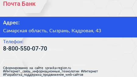 Почта Банк по адресу Самарская область, Сызрань, Кадровая, 43 в дальнейшем Организация, размещена в следующих категориях: