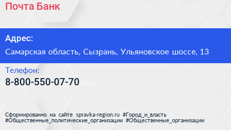 Почта Банк по адресу Самарская область, Сызрань, Ульяновское шоссе, 13 в дальнейшем Организация, размещена в следующих категориях: