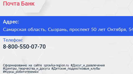 Почта Банк по адресу Самарская область, Сызрань, проспект 50 лет Октября, 54 в дальнейшем Организация, размещена в следующих категориях: