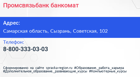 Промсвязьбанк, банкомат по адресу Самарская область, Сызрань, Советская, 102 в дальнейшем Организация, размещена в следующих категориях: