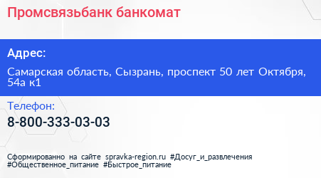Промсвязьбанк, банкомат по адресу Самарская область, Сызрань, проспект 50 лет Октября, 54а к1 в дальнейшем Организация, размещена в следующих категориях: