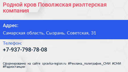 Родной кров, Поволжская риэлтерская компания по адресу Самарская область, Сызрань, Советская, 31 в дальнейшем Организация, размещена в следующих категориях: