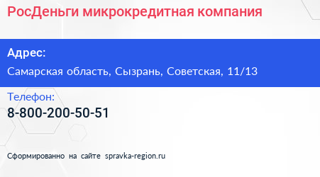 РосДеньги, микрокредитная компания по адресу Самарская область, Сызрань, Советская, 11/13 в дальнейшем Организация, размещена в следующих категориях: