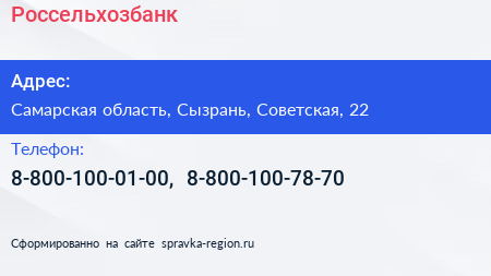 Россельхозбанк по адресу Самарская область, Сызрань, Советская, 22 в дальнейшем Организация, размещена в следующих категориях: