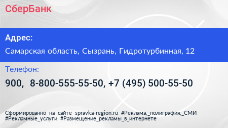 СберБанк по адресу Самарская область, Сызрань, Гидротурбинная, 12 в дальнейшем Организация, размещена в следующих категориях: