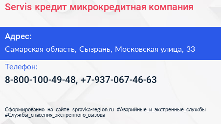 Servis-кредит, микрокредитная компания по адресу Самарская область, Сызрань, Московская улица, 33 в дальнейшем Организация, размещена в следующих категориях: