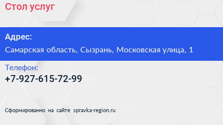 Стол услуг по адресу Самарская область, Сызрань, Московская улица, 1 в дальнейшем Организация, размещена в следующих категориях: