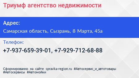 Триумф, агентство недвижимости по адресу Самарская область, Сызрань, 8 Марта, 45а в дальнейшем Организация, размещена в следующих категориях: