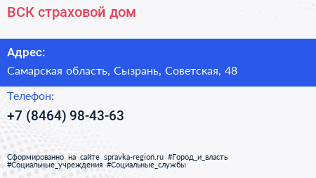 ВСК, страховой дом по адресу Самарская область, Сызрань, Советская, 48 в дальнейшем Организация, размещена в следующих категориях: