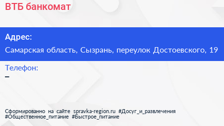 ВТБ, банкомат по адресу Самарская область, Сызрань, переулок Достоевского, 19 в дальнейшем Организация, размещена в следующих категориях: