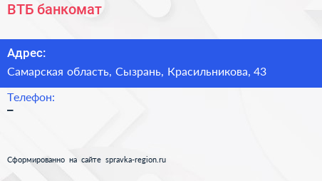 ВТБ, банкомат по адресу Самарская область, Сызрань, Красильникова, 43 в дальнейшем Организация, размещена в следующих категориях: