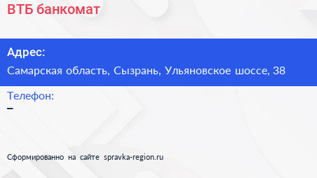 ВТБ, банкомат по адресу Самарская область, Сызрань, Ульяновское шоссе, 38 в дальнейшем Организация, размещена в следующих категориях: