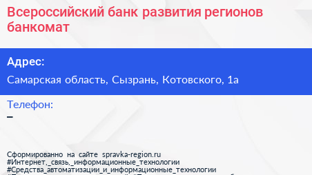 Всероссийский банк развития регионов, банкомат по адресу Самарская область, Сызрань, Котовского, 1а в дальнейшем Организация, размещена в следующих категориях:
