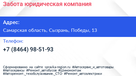 Забота, юридическая компания по адресу Самарская область, Сызрань, Победы, 13 в дальнейшем Организация, размещена в следующих категориях: